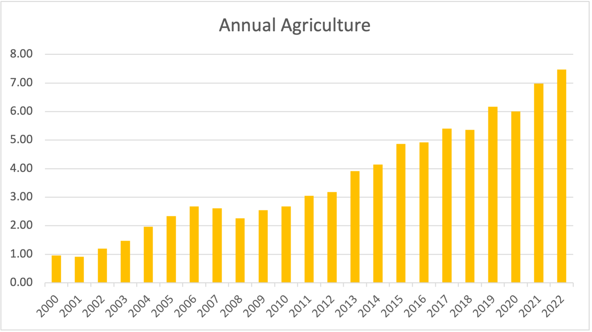 The area used for annual agriculture has increased significantly from about 1.0 Mha in 2000 to 7.5 Mha in 2022, the largest percentual gain for all mapped classes. This growth can be largely attributed to the expansion of soy plantations in the region.