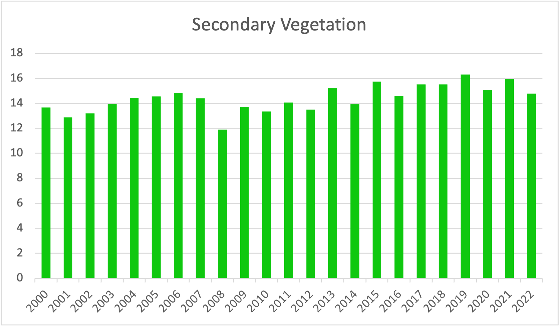Secondary vegetation has remained fairly constant during the 2000-2020 period, ranging from 13 Mha to 15.5 Mha. When compared to the expansion of agriculture and spatial expansion of pasture, while keeping the total pasture area constant), these numbers suggest a period cycle of abandonment and reuse of part of the land.